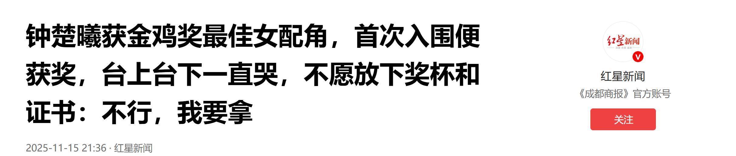 站在金鸡奖的舞台上,这一次,钟楚曦终于不是“抢”来的主角,而是实打实靠作品赢得掌声的演员。