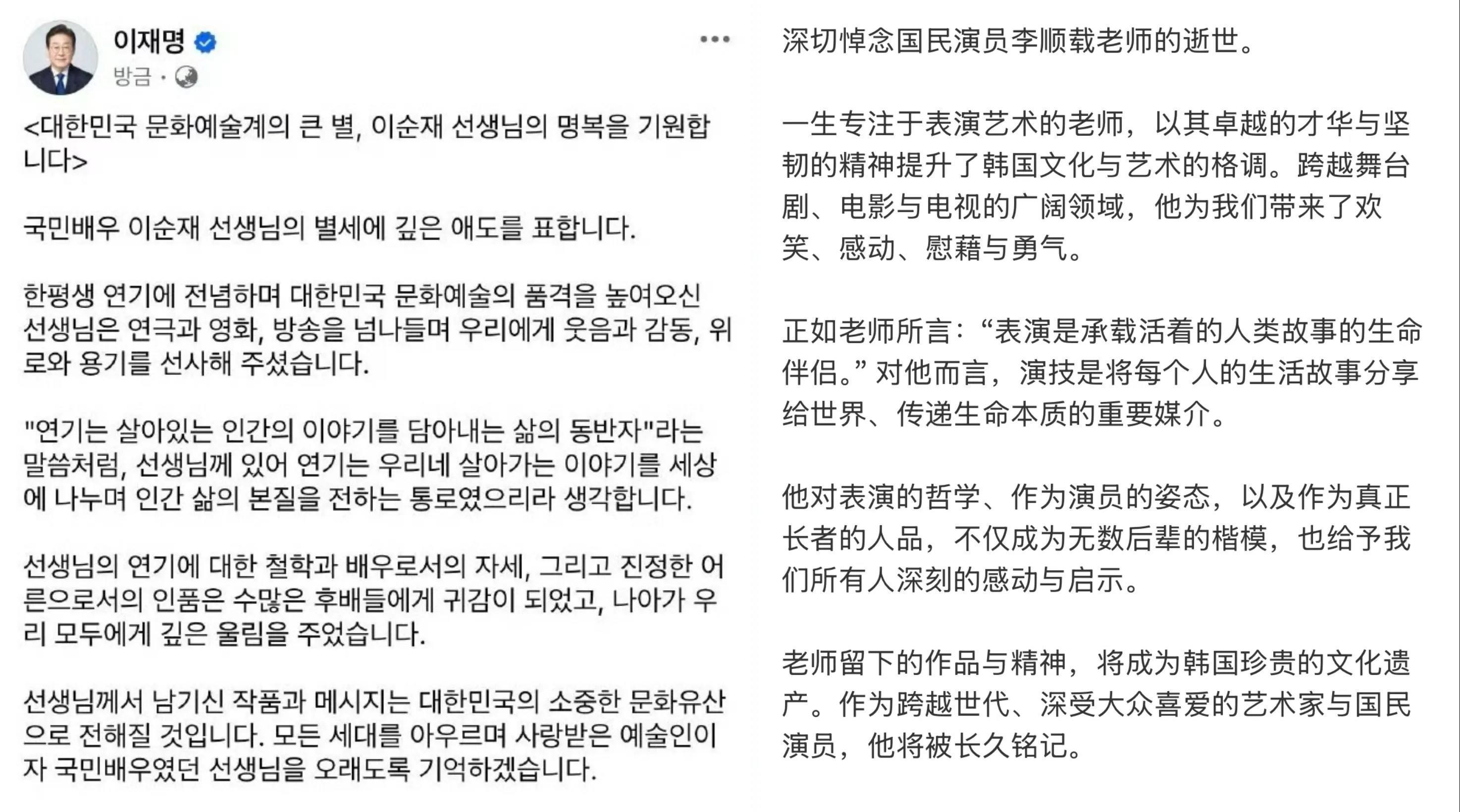 完全没想到李在明竟然会向一名老戏骨,老演员,郑重其事的在社交平台发布悼念文!毕竟在他们的世界,演员的社会地位并不高,且背后还有人把控着一切,并且收入也不高像李顺载这样的演员并不是只有他一人,离世的也不只有他一人,但得到李在明这级别的人悼念的,在他们的世界里,李顺载是第一个!
